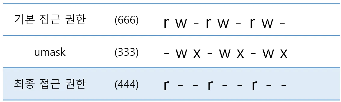 - umask 333 은 쓰기(2)와 실행(1) 권한을 제거함
