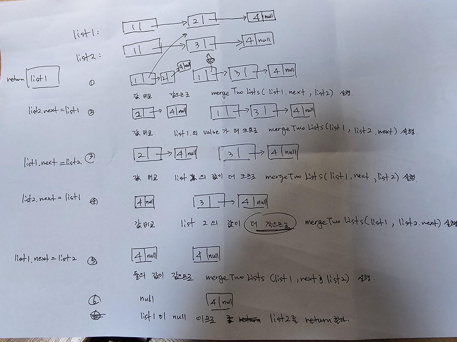 매개변수로 들어온 값들의 value를 비교하여 ListNode의 인스턴스를 만들어서 노드를 연결시켜 줬습니다.