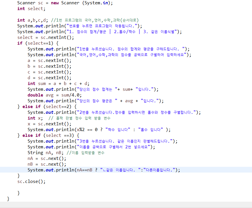 스캐너에서 번호를 입력 받아서 아래 내용을 작동 시키는 프로그램을 작성