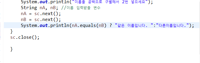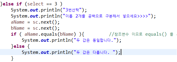 틀린부분, String 변수는 참조형 자료 이므로 == 로 비교 하기 어렵다. 같은이름을 넣어도 다른 이름이라고 출력