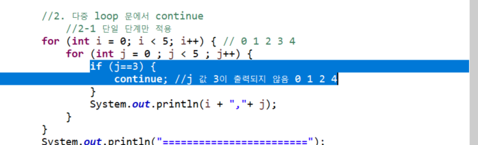if j == 3 이라면, j값 중에서 3의 값은 실행하지 않고 바깥 for문으로 다시 돌아가게함