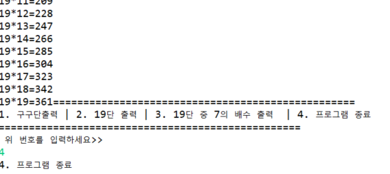System.out.println("1. 구구단출력 | 2. 19단 출력 | 3. 19단 중 7의 배수 출력 | 4. 프로그램 종료");