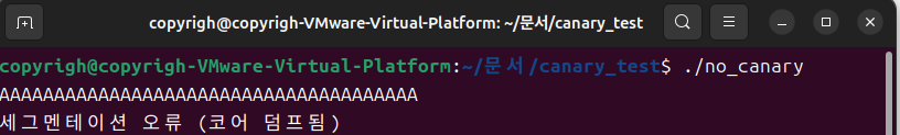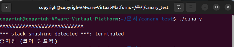 canary를 적용하여 다시 컴파일하고, 긴 입력을 주면 Segmentation fault가 아니라 stack smashing detected와 Aborted라는 에러가 발생한다. 이는 스택 버퍼 오버플로우가 탐지되어 프로세스가 강제 종료되었음을 의미한다.