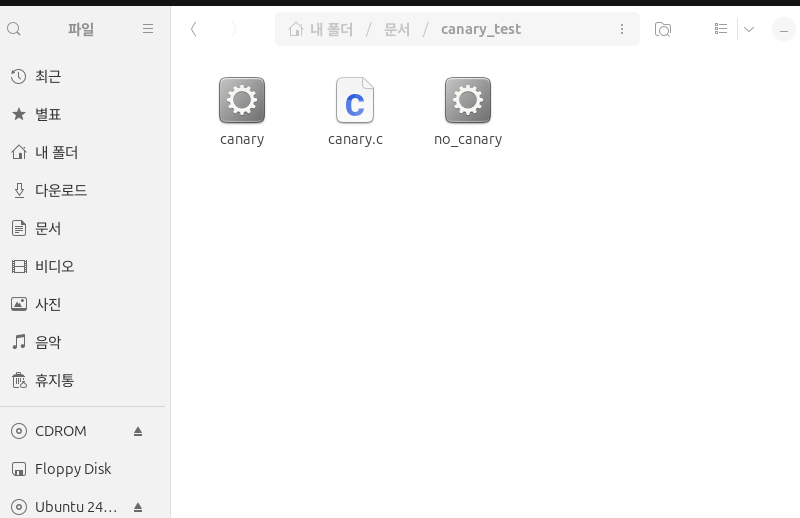 위의 간단한 예시 코드를 이용해서 하나는 그냥 실행 파일을 만들고, 다른 하나는 -fno-stack-protector gcc 옵션을 이용해서 canary를 제거한다.
