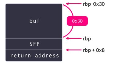 위의 그림과 같이, 위의 스택 프레임의 순서는 낮은 스택부터 buffer, canary, sfp, return address 순이다. (실제는 많이 다를 수 있음)