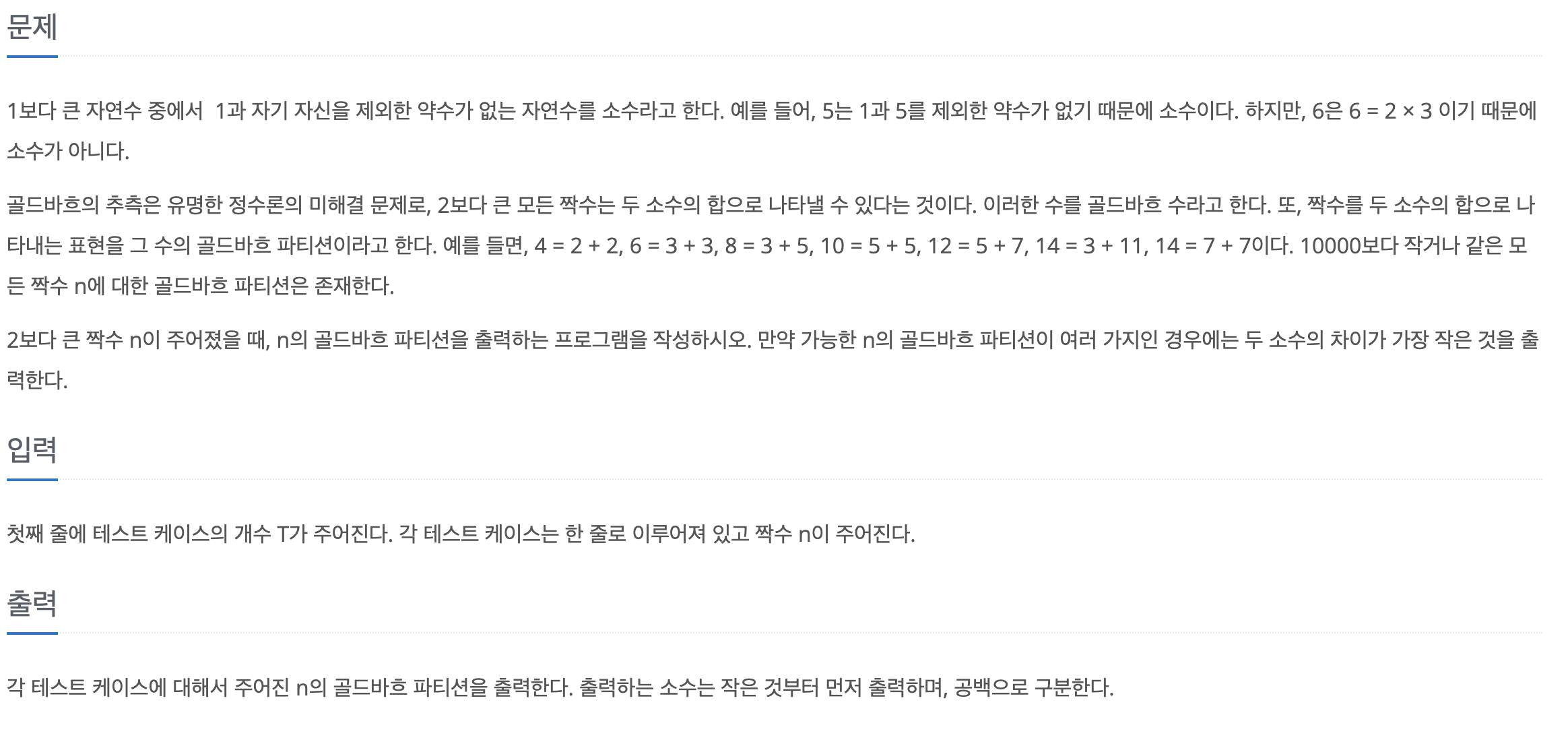 골드바흐의 추측(Goldbach's conjecture)을 기반으로, 주어진 짝수를 두 개의 소수 합으로 나타내는 문제이다.