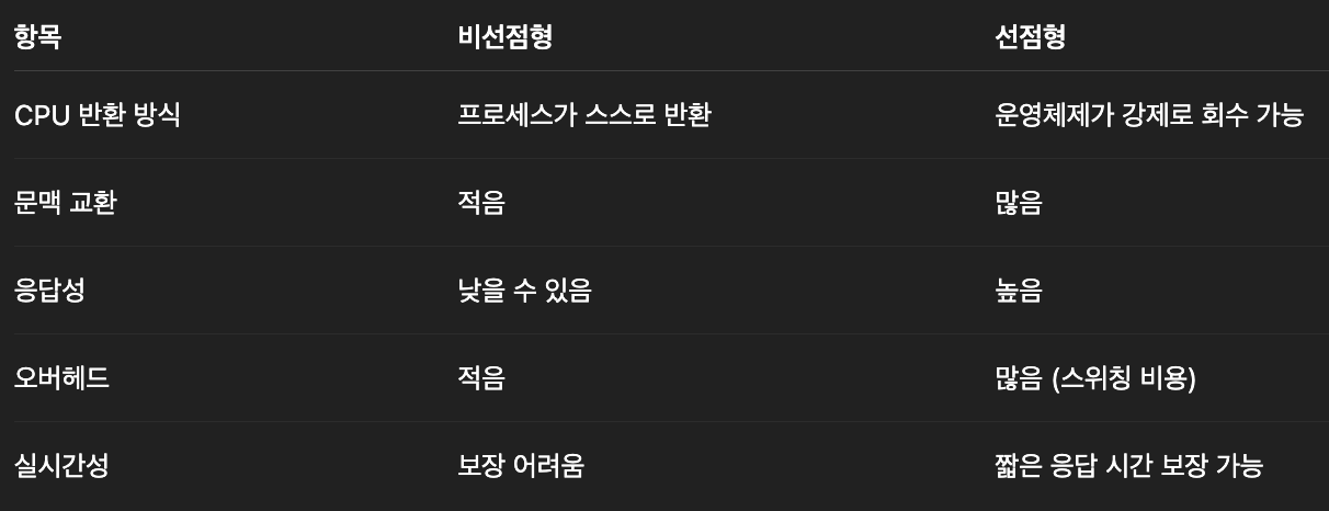 - 선점형은 응답성이 중요할 때, 비선점형은 안정성과 예측성이 필요할 때 유리