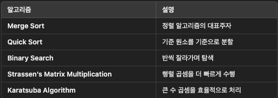 - Divide (분할) : 문제를 여러 개의 하위 문제로 나눔