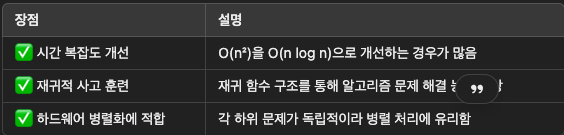 - Conquer (정복) : 하위 문제를 재귀적으로 해결