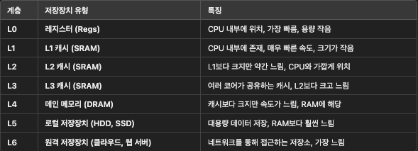- 만약 레지스터에 없으면, L1 → L2 → L3 → L4 → L5 → L6 순서로 데이터를 찾는다.