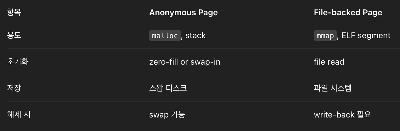 File-backed Page는 파일 기반 매핑으로, 수정 시 dirty 여부를 보고 write-back 필요