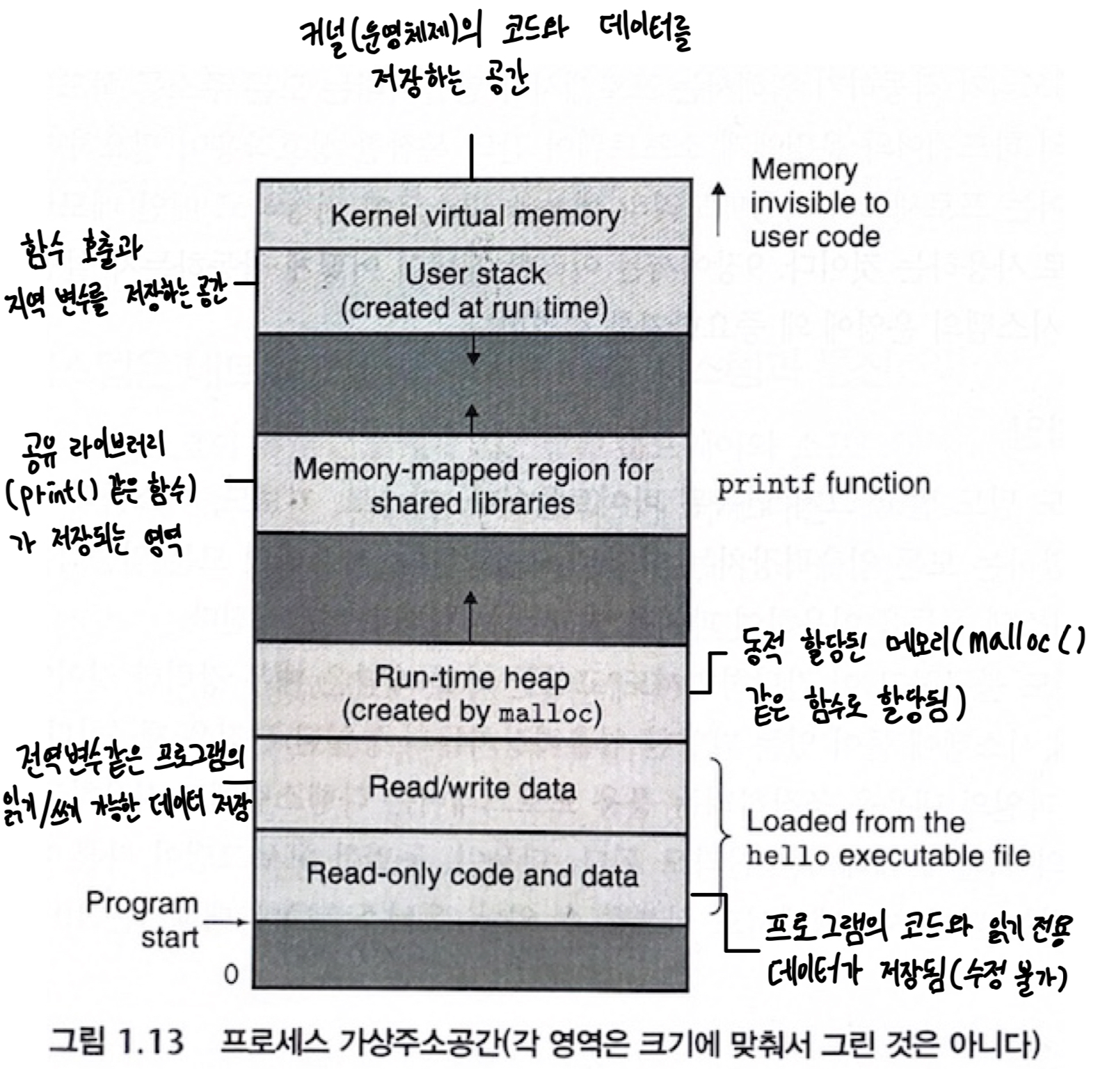 📌 그림 1.13을 보면 가상 주소 공간이 어떻게 구성되는지 나타나 있음
