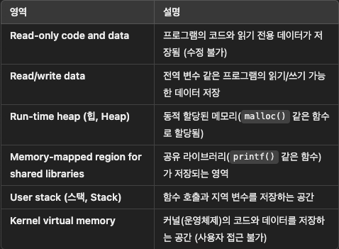 각 프로세스는 가상 주소 공간(Virtual Address Space)을 가지며, 이는 여러 개의 영역으로 나뉘어요.