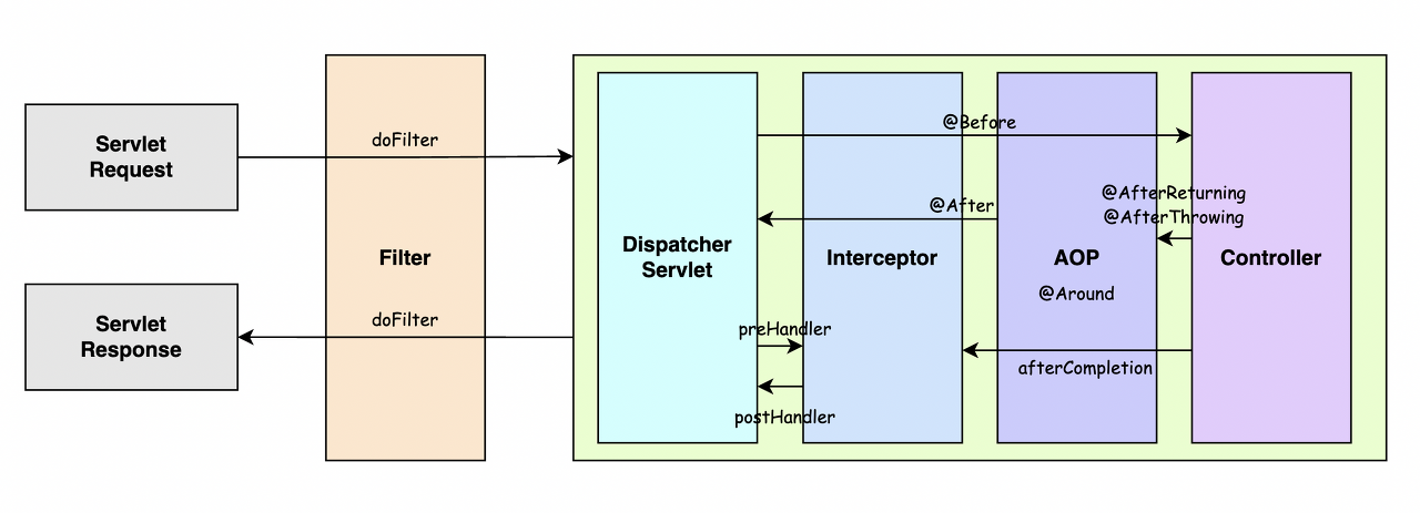 Spring Context 에 속하고, Filter 의 경우에는 Web Context에 속함즉 Filter, Interceptor, AOP의 가장 큰 차이점은 요청을 처리하는 위치와 속한곳이다.