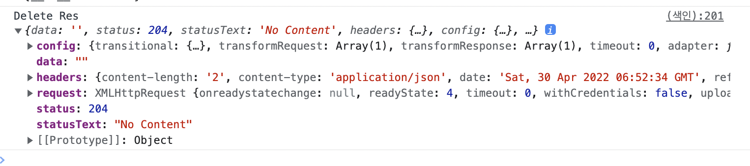 네트워크에서도 delete api 통신시 삭제 api가 204 상태 응답코드로 성공되었음을 보여준다.