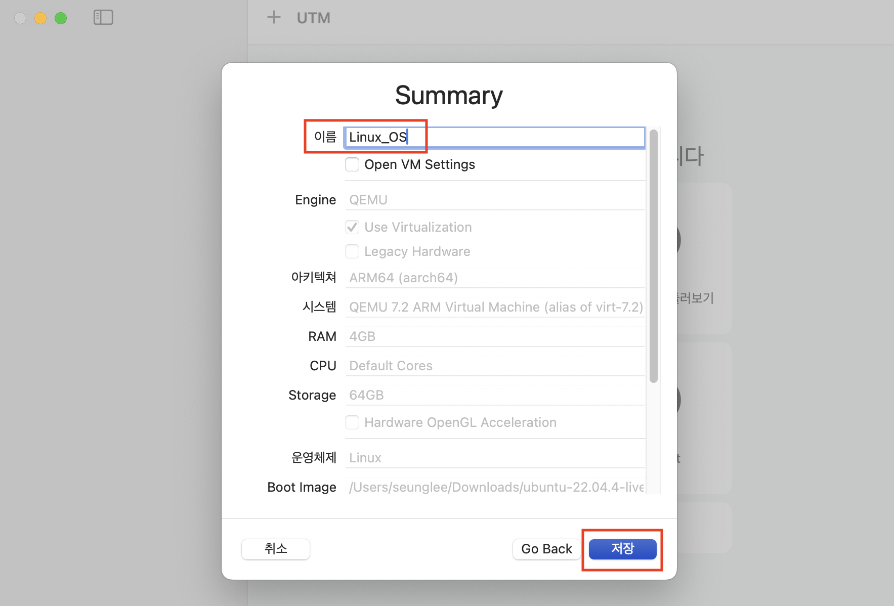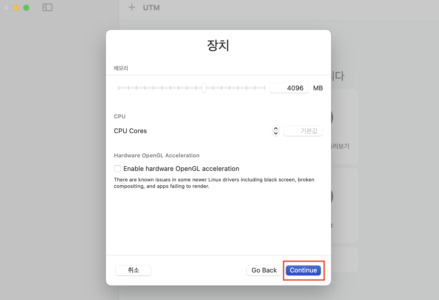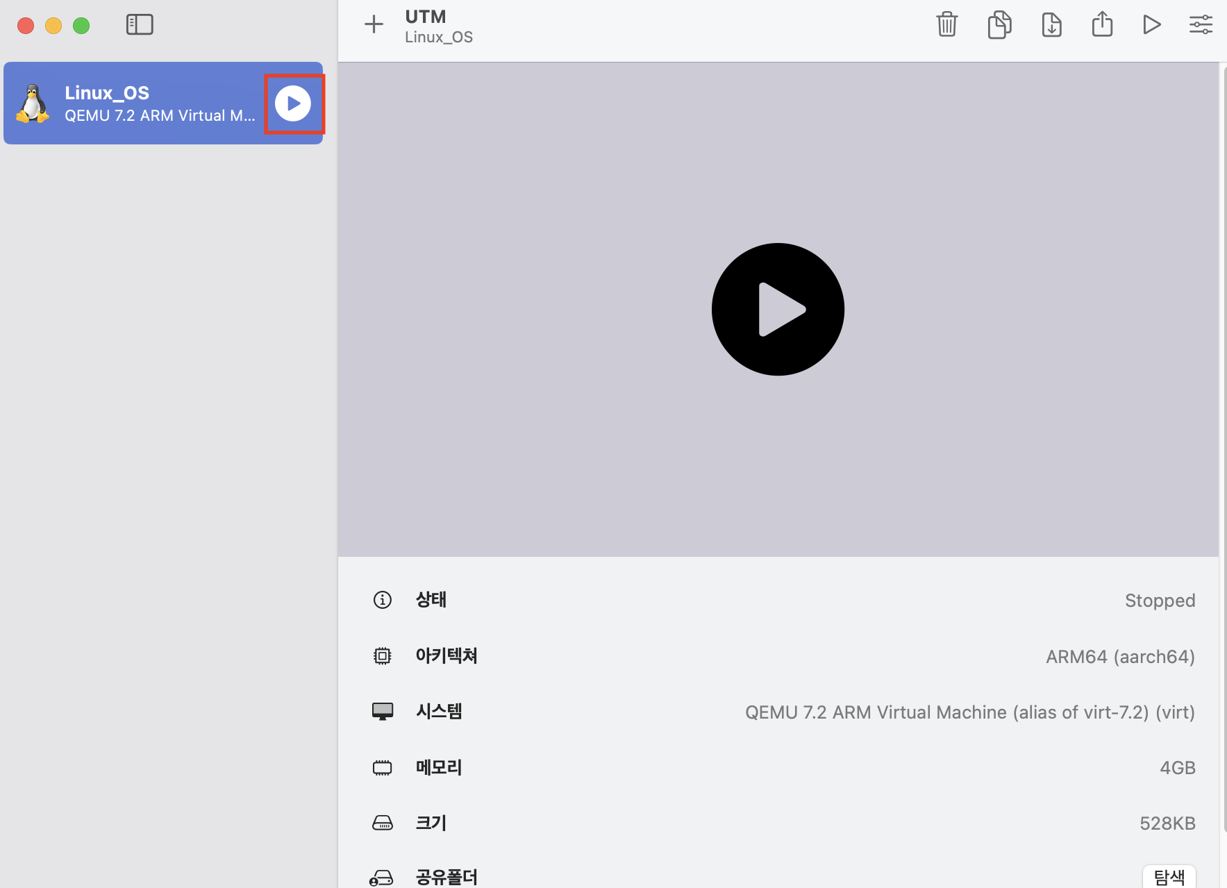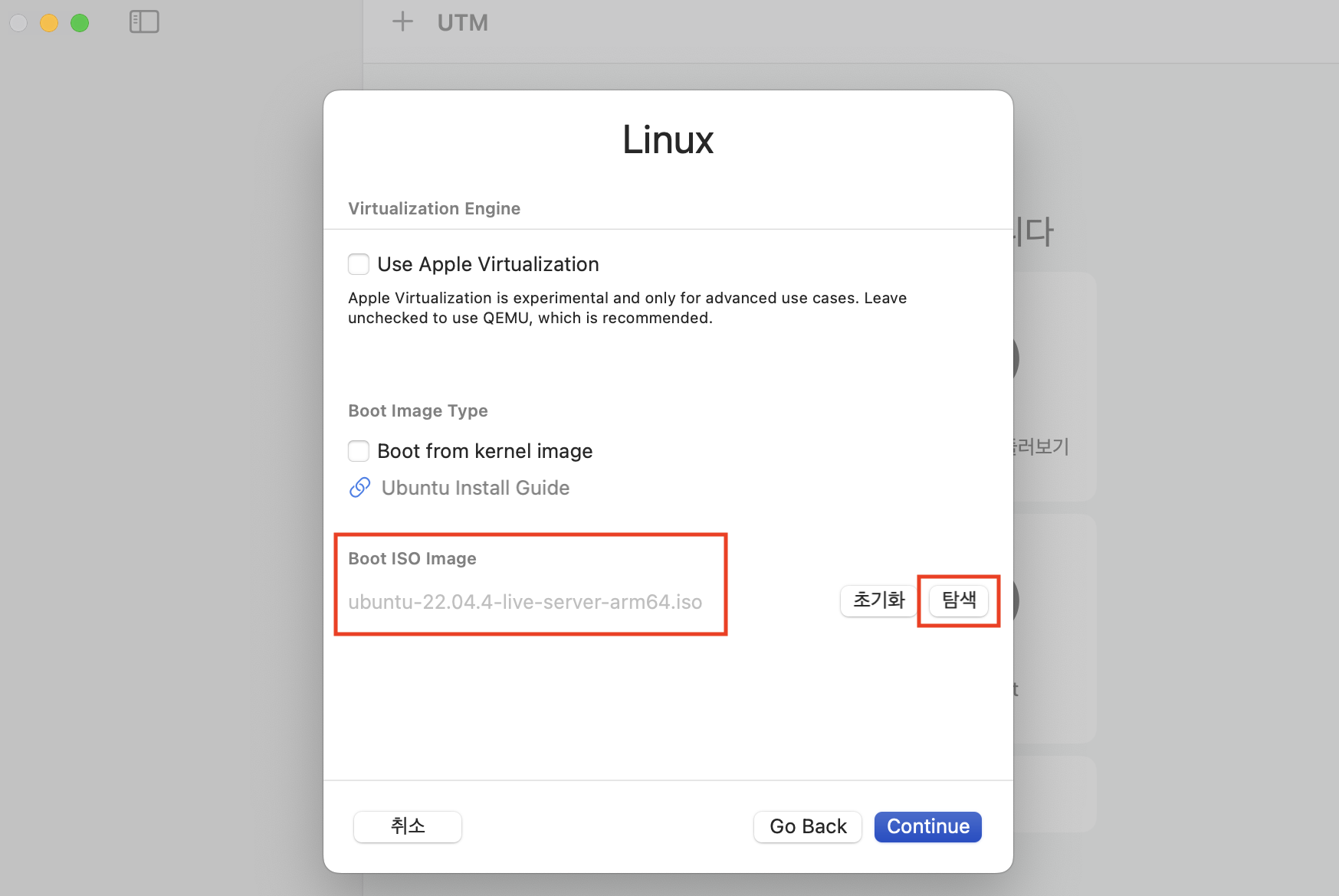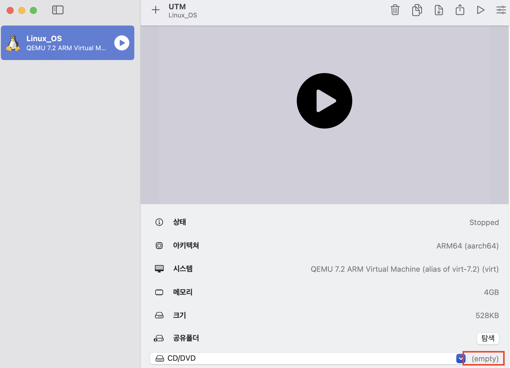 검은 화면이 나오면 꺼주고, 다시 UTM을 실행시켜서 CD/DVD 드롭바를 눌러서 "초기화" 눌러주기 후, (empty)가 되도록 해주자.