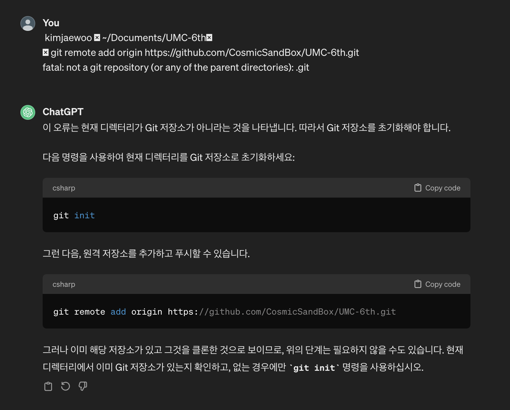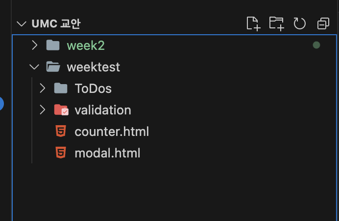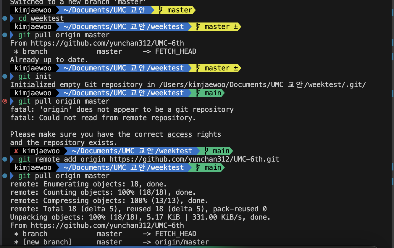 저기 위에 보면 git pull origin master(master브랜치에 1주차 교안이 있었음) 했지만 Already up to date라고 뜨는 것을 볼 수 있다. (cd weektest 했는데도 이렇게 떴다)(이미 UMC교안이라는 부모 폴더에 해당 파일들이 git pull 받아져 있는 상태였다)