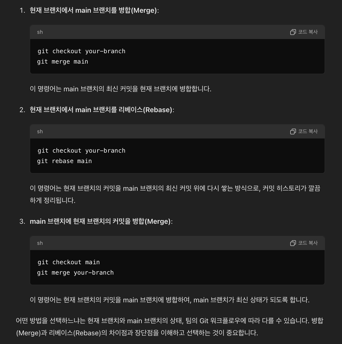 rebase관련 (branch들의 각기 다른 히스토리 관련 문제) (This branch is 4 commits ahead of, 1 commit behind main.)