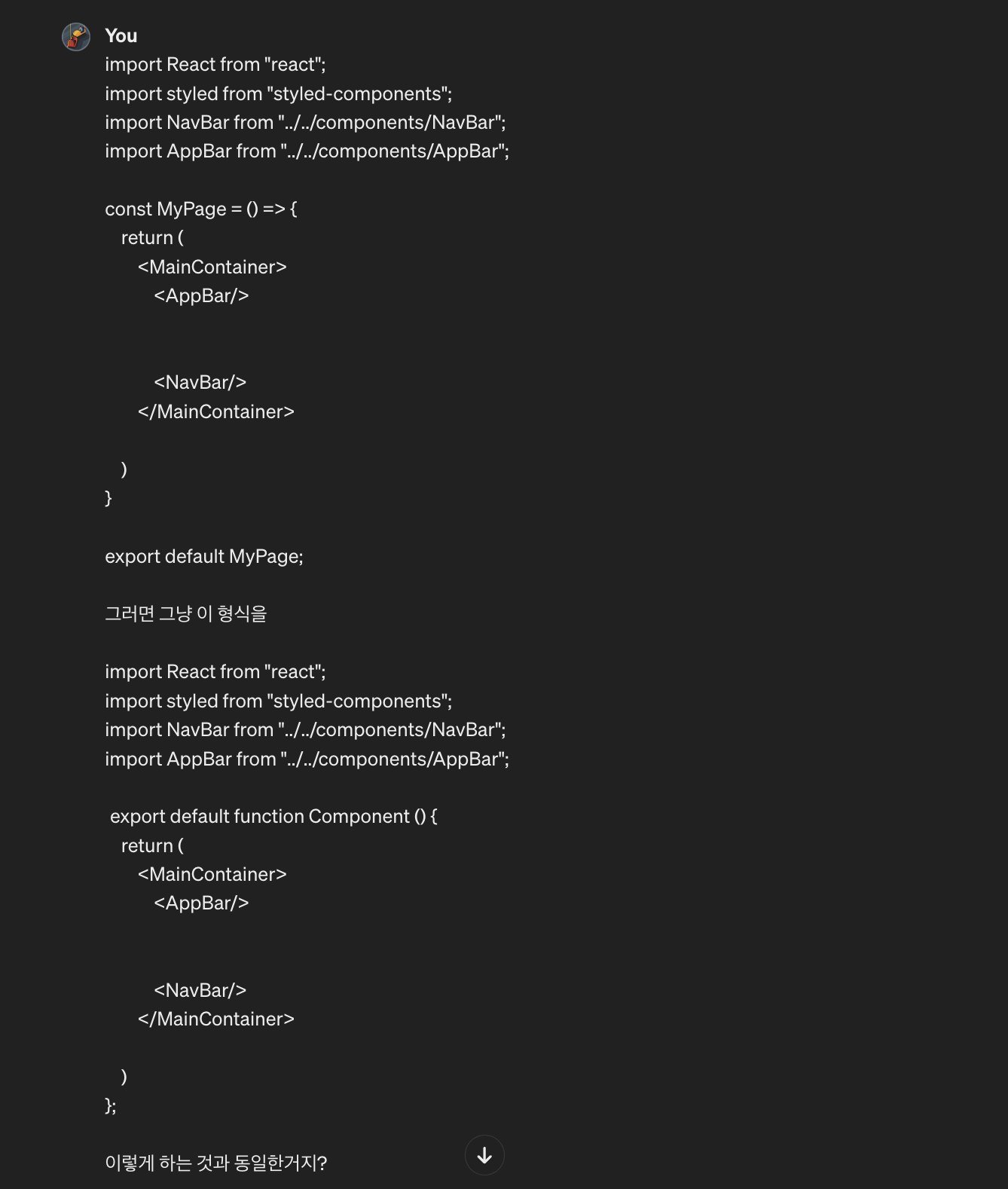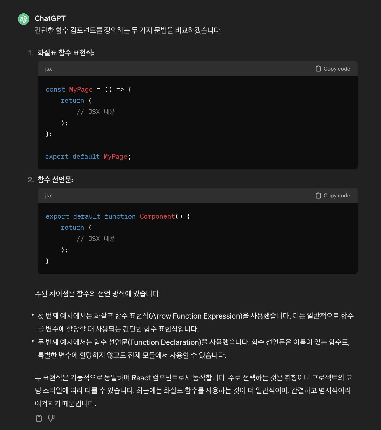 export default function 방식으로 했던 프로메테우스 AI에서는 라우팅을 이런식으로 했고 화살표 함수 형태로 했던 DevPrep 에서는 라우팅을 이런식으로 했음