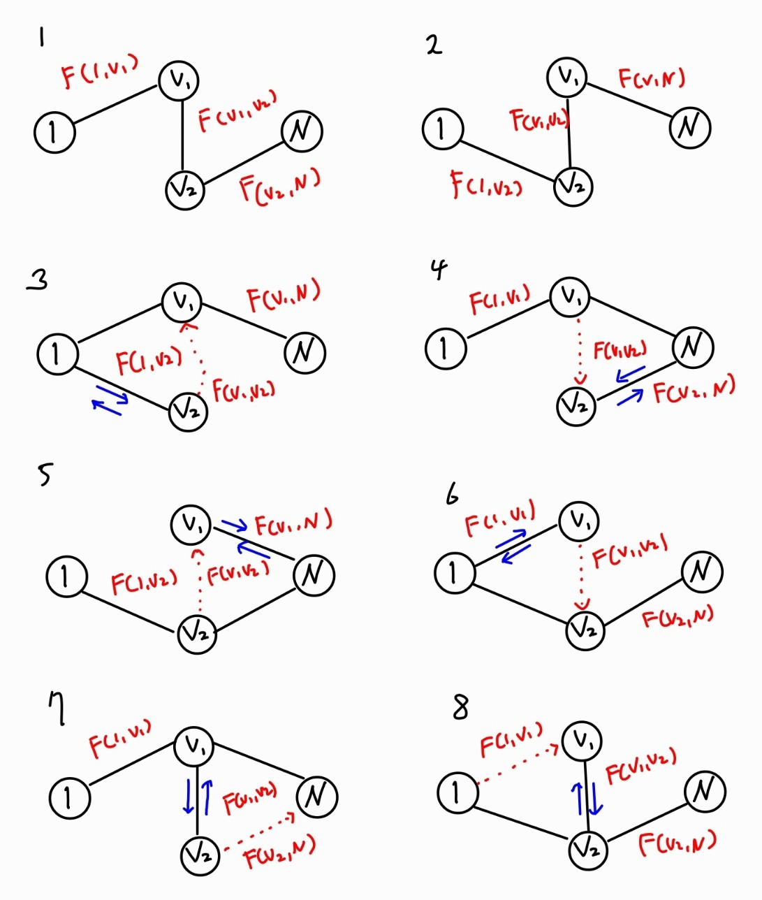 때문에 3, 4, 5, 6, 7, 8의 중복 경로가 발생하는 케이스에서 별도의 처리 없이 F(1, v1) + F(v1, v2) + F(v2, N) 또는 F(1, v2) + F(v1, v2) + F(v1, N)으로 최단 경로를 구할 수 있다. 둘 중 더 작은 값이 정답이다.