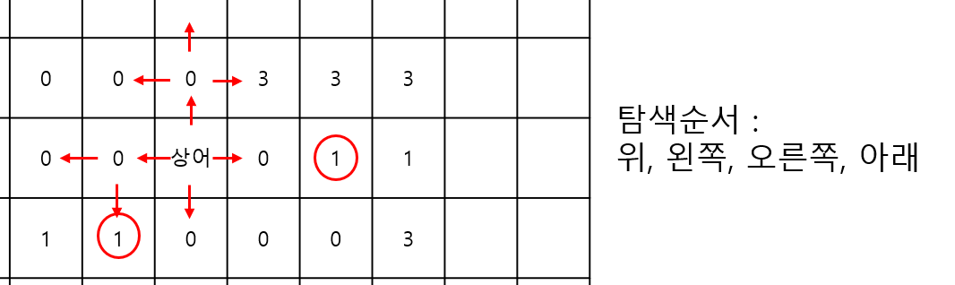 BFS에 오른쪽 탐색 순서를 적용한 결과, 실제로 먹어야 하는 상어 오른쪽의 1이 아니라 상어 왼쪽 아래의 1을 먼저 발견하게 된다.