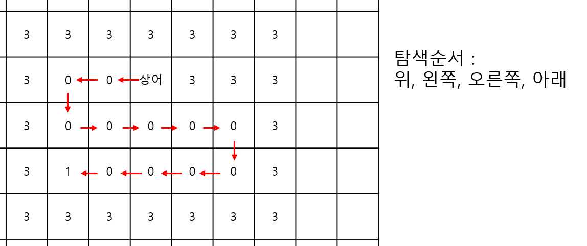 문제의 조건 중 동일한 거리의 물고기 중에선 가장 위에 있으며 가장 왼쪽에 있는 물고기를 먹으러 간다고 했다. 여러 다른 문제들을 해결하면서 DFS나 BFS가 그리드를 순회할 때 다음과 같은 방식으로 순회를 했다.