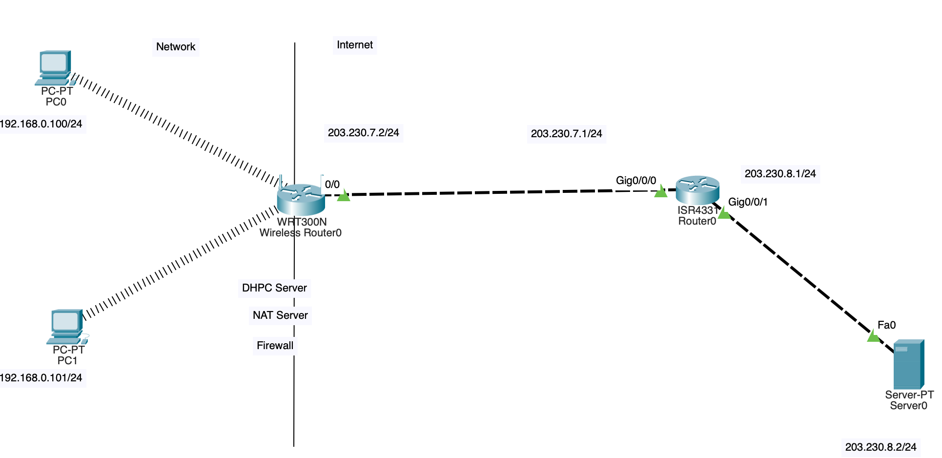 PC0의 Gateway에 가상의 IP(203.230.7.100/24)를 할당