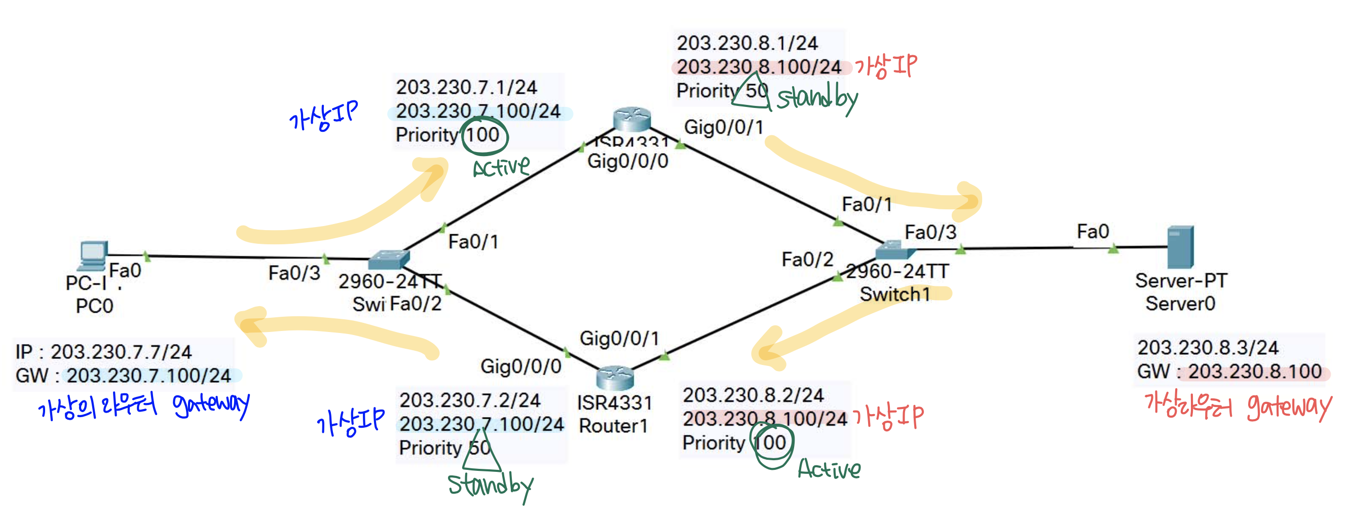 3. standby router는 active router를 관찰하다가 이상이 발생하면 자신이 active router가 되어 라우팅을 한다.