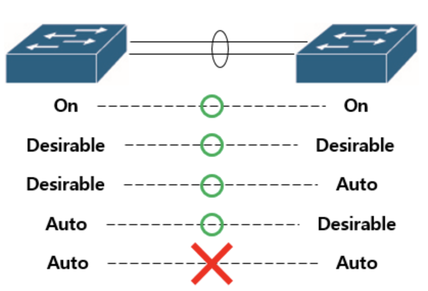 On : PAgP 또는 LACP를 사용하지 않고 이더채널을 정적으로 시작. 반드시 상대방도 수동 On 모드로 동작해야 한다.