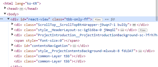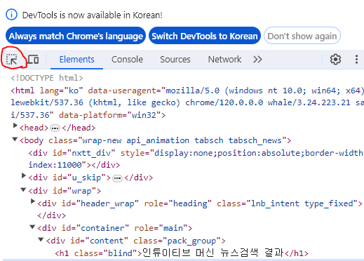 해당 버튼을 클릭해 각 부분의 html 코드를 볼 수 있다