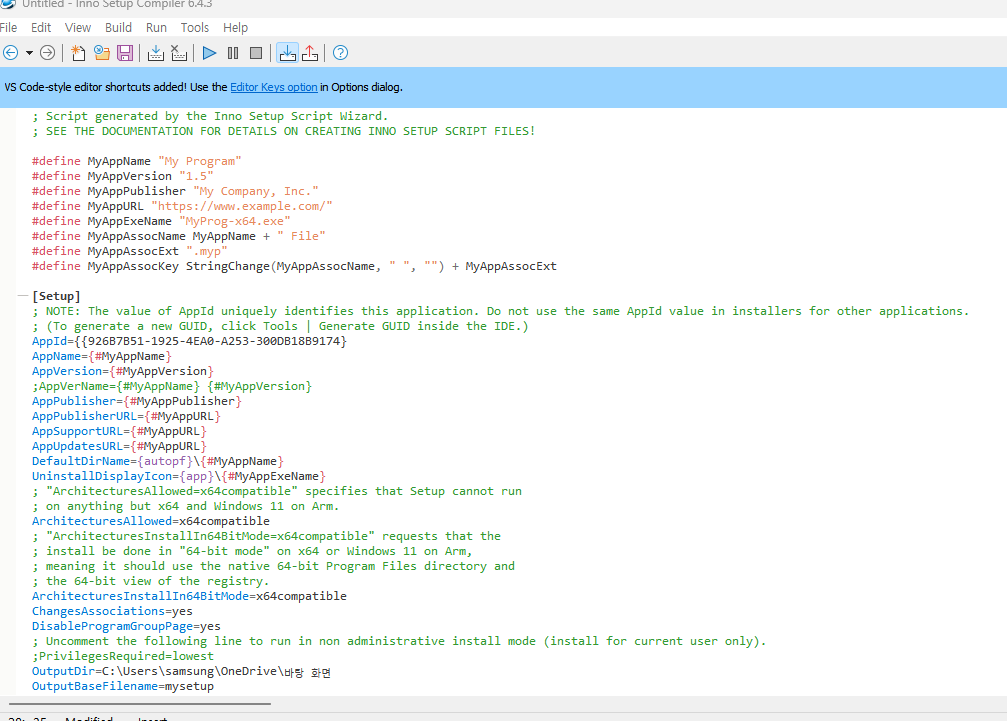지금까지 GUI를 사용하여 기본적인 Script를 자동으로 생성한 결과가 .iss 파일로 나타나며,