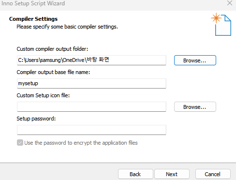 Installer 파일의 생성 경로, 아이콘, 패스워드 등을 설정할 수 있습니다.