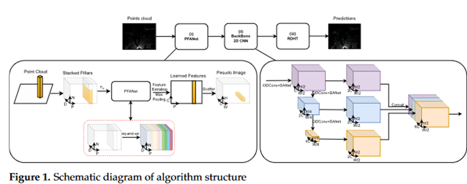 1) 그리드 기반 방법 중 하나인 PointPillars 모델을 사용, 포인트 클라우드데이터를 직접 처리하고, 특징을 추출하여 매우 빠르게 동작하지만 작은 물체를 잘 감지 못하는 단점이 있음
