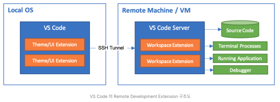- 그림에서 보듯이 Local Machine에서 VS Code 를 이용하여 작업하지만, 그 작업 대상은 Remote Machine으로 해당 Machine에 접속해 VS Code Server를 설치하고 해당 Machine에서 동작할 필요한 Extension 설치 후 마치 Local Machine에서 하듯이 코드 개발, 실행, 테스트 등을 수행할 수 있다는 원리이다.