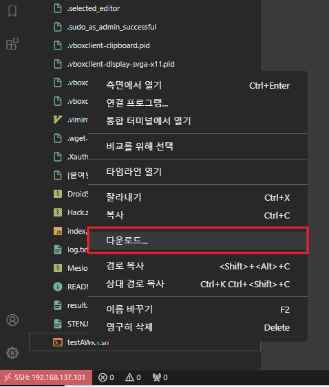 - 원하는 파일에서 우클릭 -> 다운로드로 받을 수 있다.
