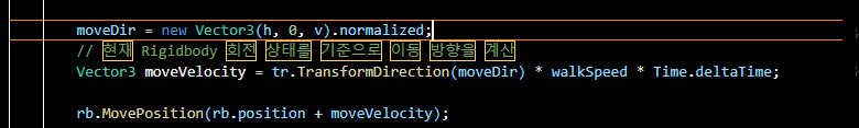 처음에 변환없이 rigidbody.MovePosition 함수를 이용했더니 캐릭터가 이상하게 움직이길래 열심히 찾아 봤더니....