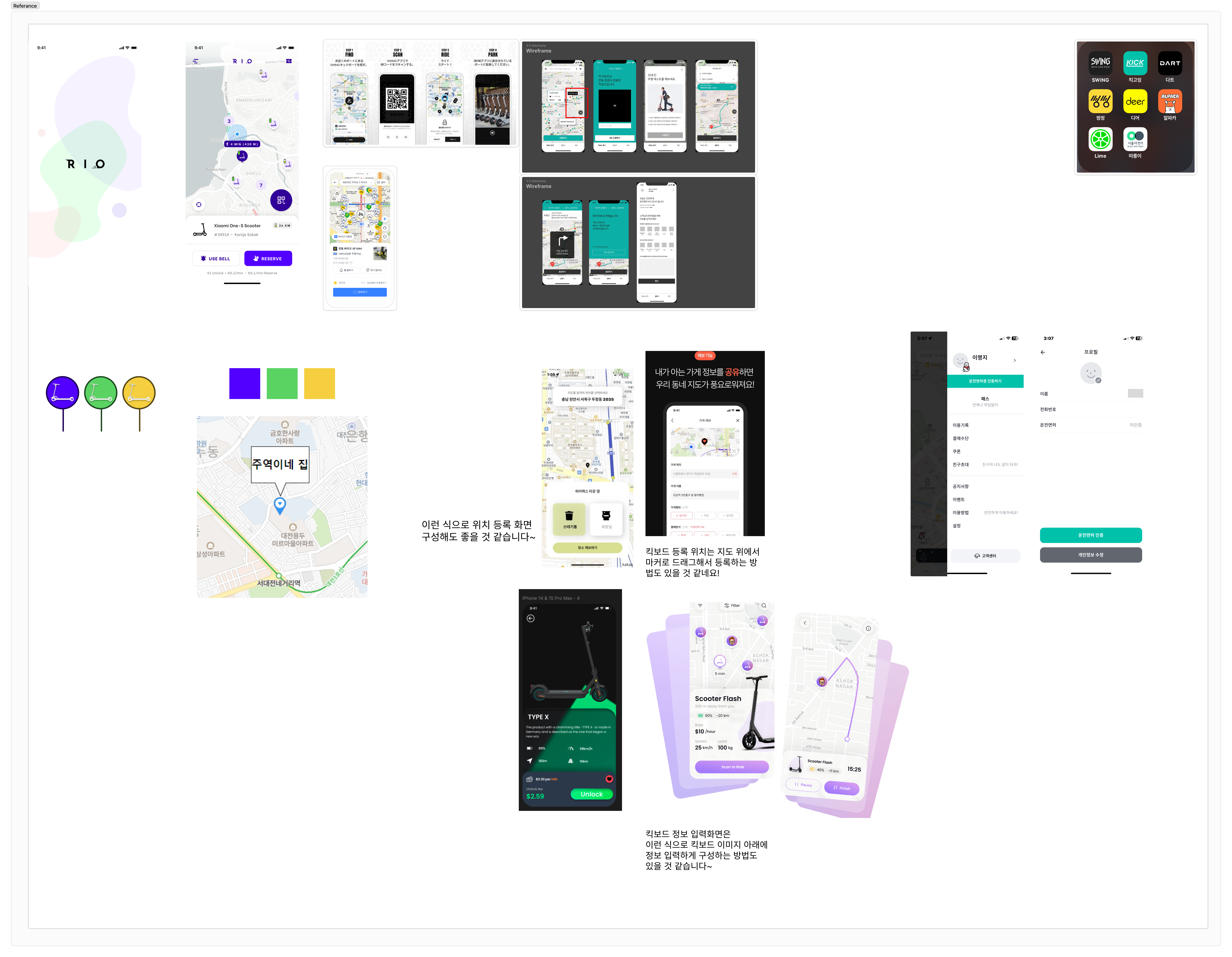 프로젝트명까지 정한 이후에는 빠르게 UI 디자인을 시작했다. 필요한 페이지들은 정해져 있었기 때문에 시중에 나와있는 공용 킥보드 앱 등의 레퍼런스를 가져와 우리만의 스타일로 만들고자 하였고, 인터넷 서칭을 통해 적합한 디자인을 벤치마킹하여 제작하였다.