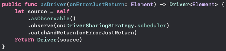 즉, Driver는 이 코드를 통해 항상 메인스레드에서 동작되는 것을 보장하는 것이다. Driver는 애초에 UI 업데이트를 위해 사용하는 옵저버블이므로, 항상 메인스레드에서 동작하는 것이 보장되어 개발자의 일을 하나 줄여주는 것이라고 볼 수 있다.