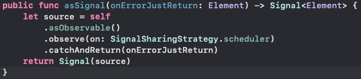 또, Signal을 만드는 asSignal()을 살펴보면 Driver와 같이 에러를 반환하지 않고 기본값을 반환하도록 처리가 되어있는 모습을 볼 수 있다.