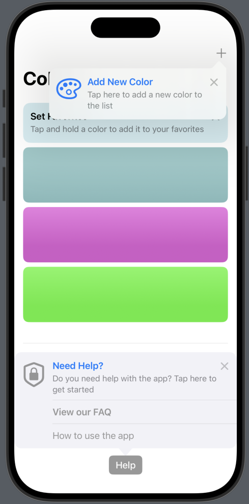 import Foundation import TipKit struct AddColorTip: Tip { var title: Text { Text("Add New Color") .foregroundStyle(Color.blue) } var message: Text? { Text("Tap here to add a new color to the list") } var image: Image? { Image(systemName: "paintpalette") } }