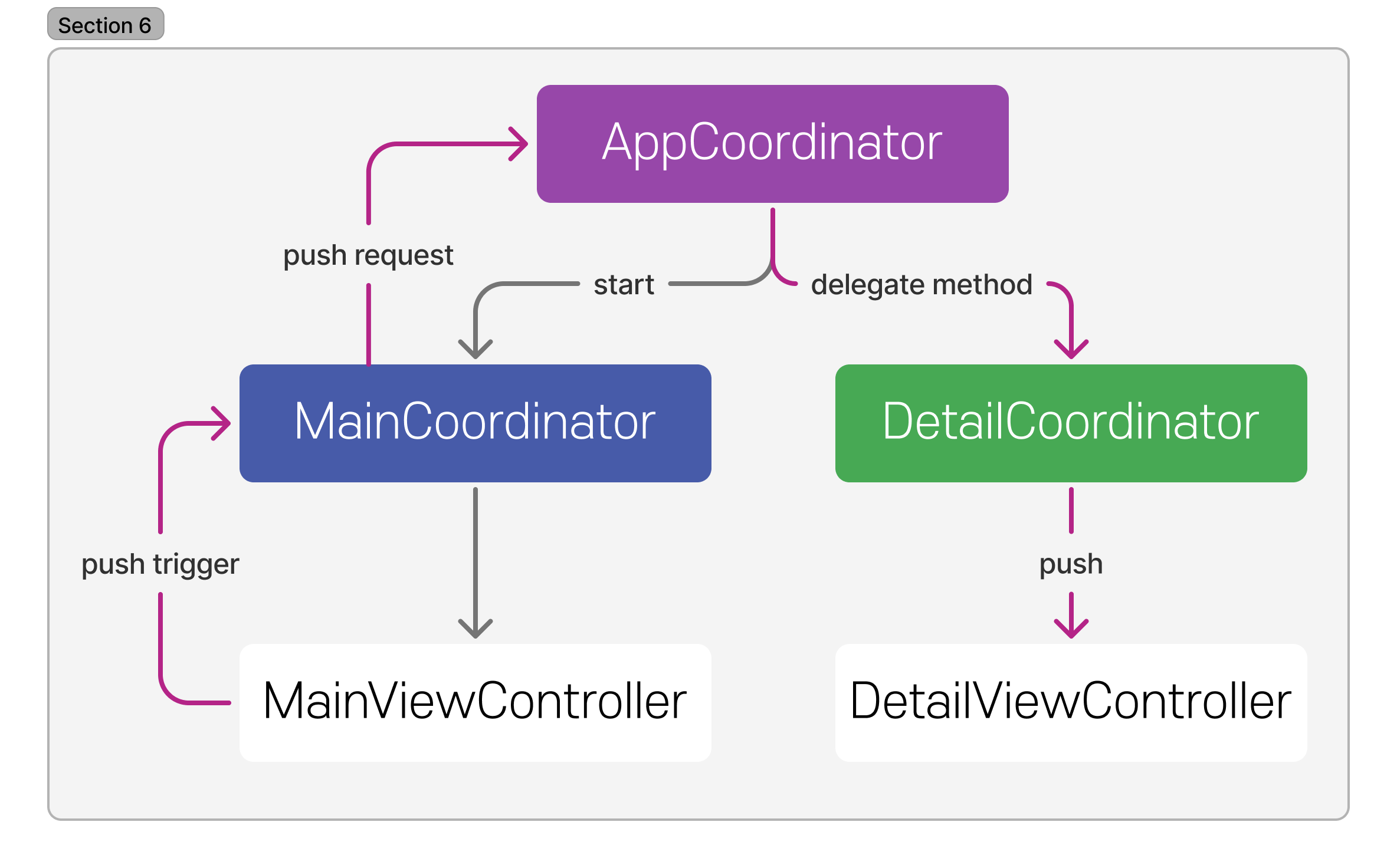이러한 문제를 해결하기 위해 Coordinator 패턴은 화면 전환 로직을 별도의 객체로 분리하여 관리한다.