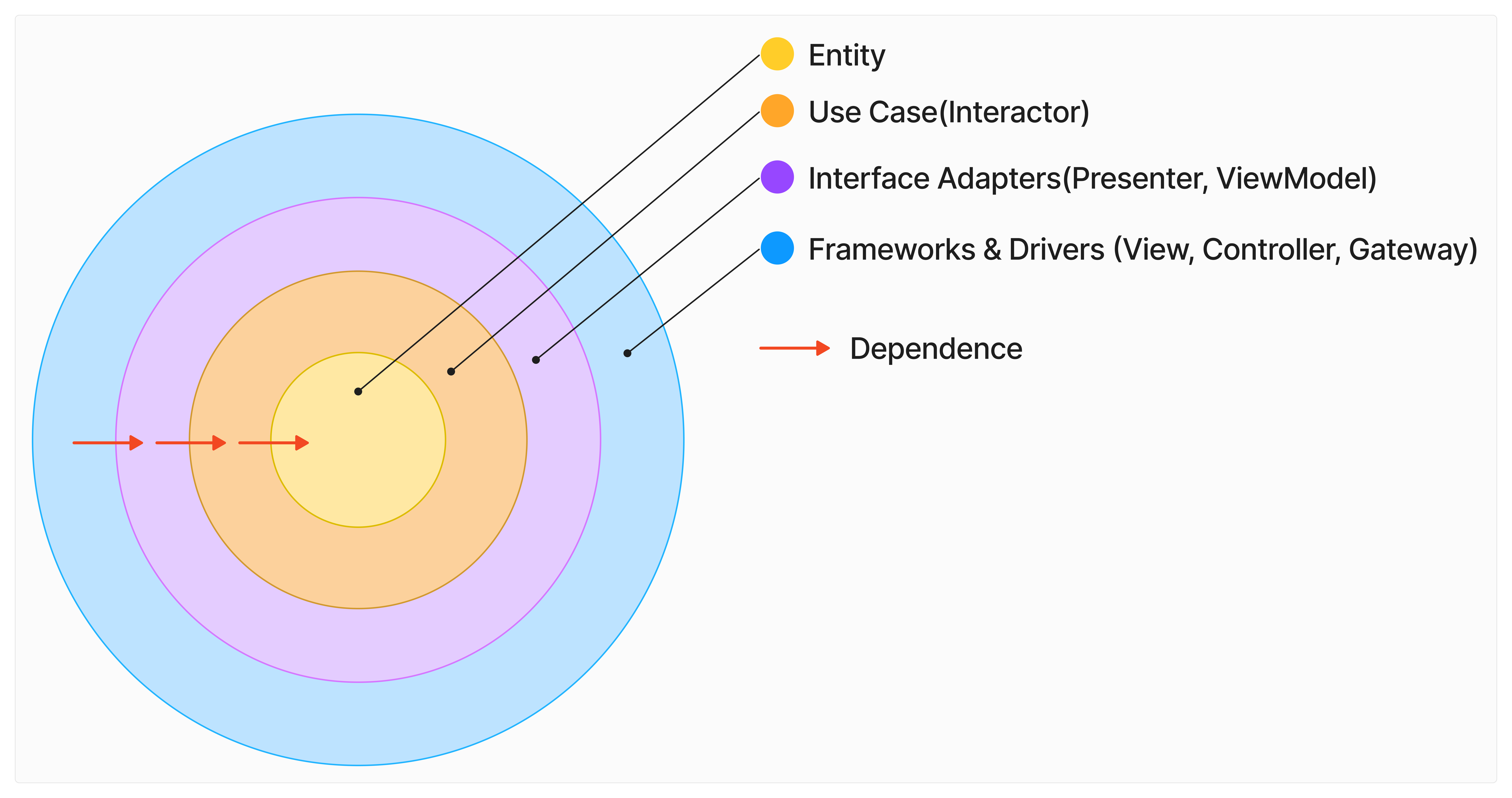 Clean Architecture는 의존성 역전 원칙(Dependency Inversion Principle)에 기반하며, 비즈니스 로직을 중심으로 계층을 나눠 의존성을 제어한다. 이 때, 내부 계층은 외부 계층에 의존하지 않는다는 원칙을 준수한다.