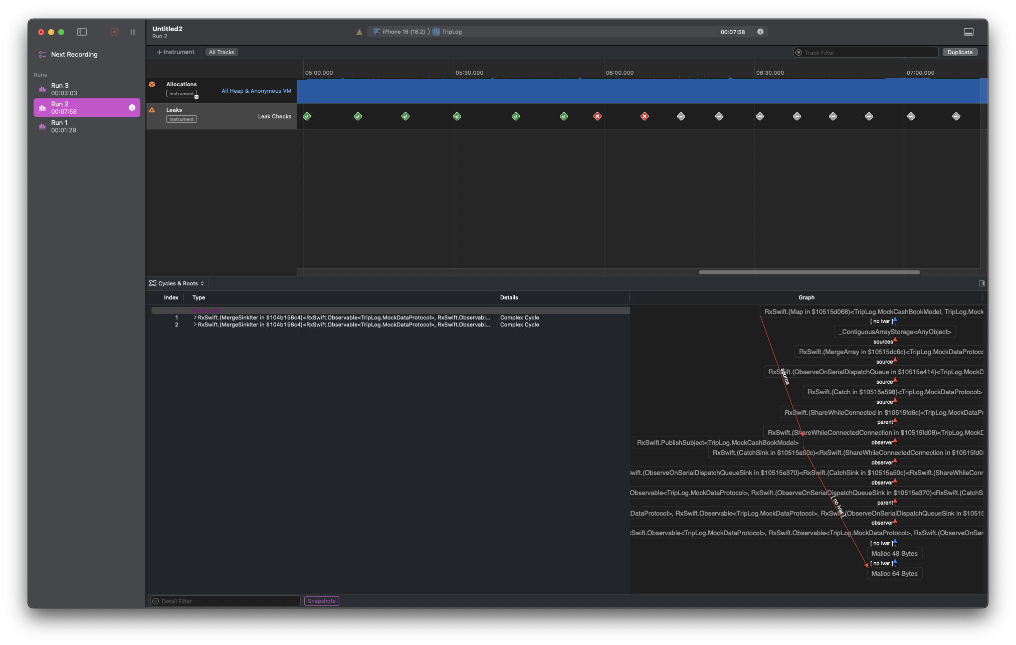 어쨌든 어떤 부분이 문제인지 알아야 하기 때문에 하단의 Leak 내용을 봤는데, RxSwift의 코드에서 문제가 발생한 것 같았다.