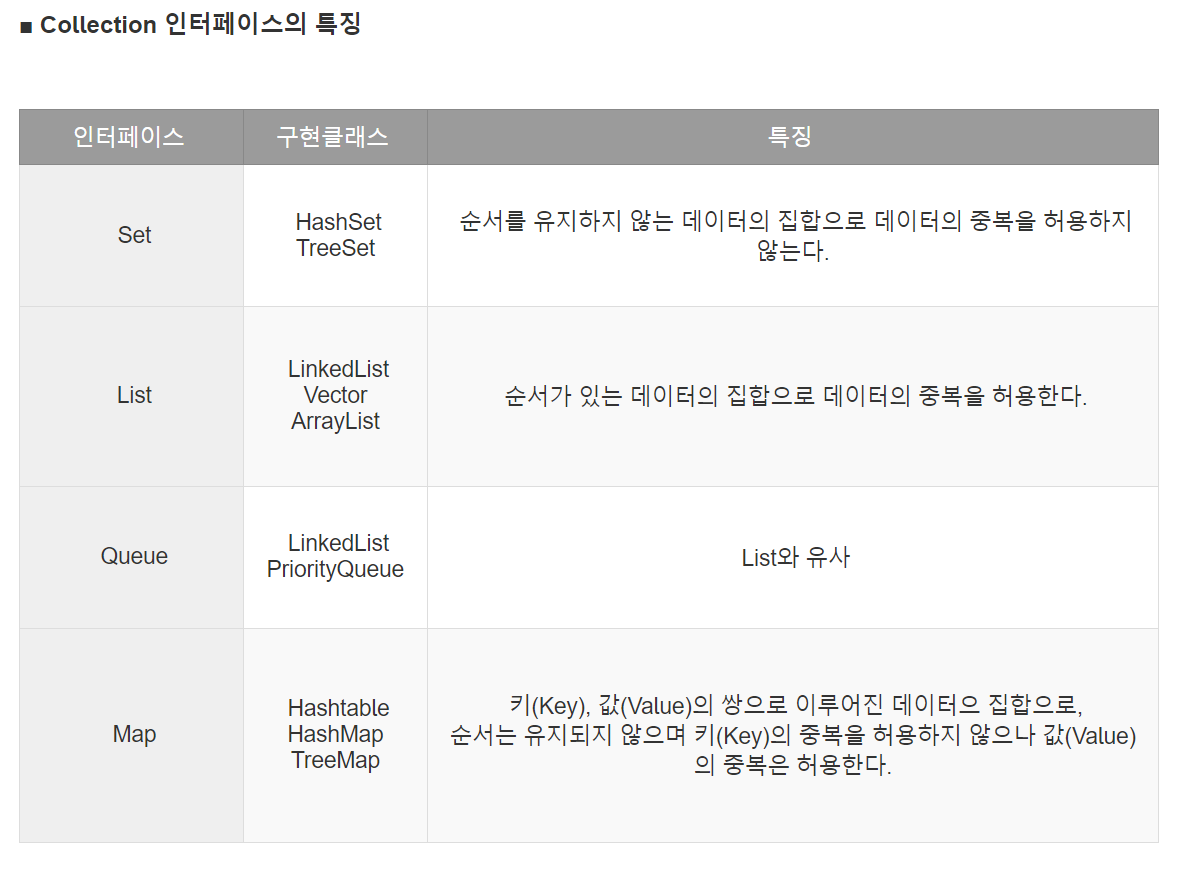 ** Map의 경우 Collection 인터페이스를 상속 받지 않지만 Collection으로 분류한다.