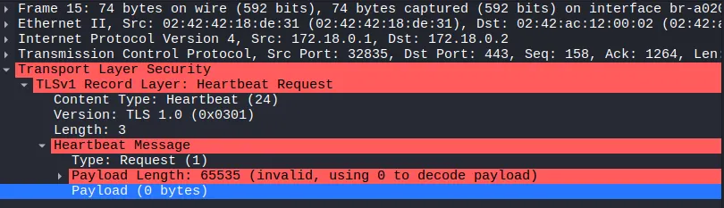Wireshark로 캡처한 ‘Heartbeat Request’ 패킷을 분석해 보면, 자신의 페이로드(Payload) 길이가 65535바이트라고 주장하는 것을 볼 수 있다. 하지만 실제로는 아무런 데이터도 보내지 않았거나 아주 작은 크기의 데이터를 전송했다.