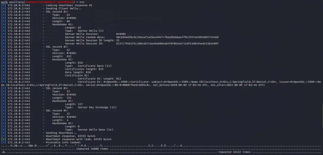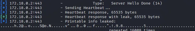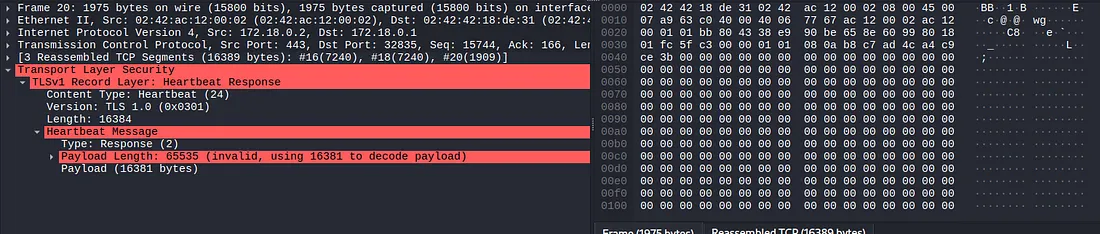 한 가지 흥미로운 점은 공격자는 65535바이트를 요청했지만, 서버의 응답 패킷은 약 16381바이트 정도의 데이터를 담고 있다는 것이다. 이는 TLS 프로토콜의 규격상 하나의 레코드(전송 단위)에 담을 수 있는 데이터의 최대 크기가 16384바이트(16KB)로 제한되어 있기 때문이다. 서버는 공격자의 요청을 모두 이행하기 위해 65535바이트를 메모리에서 읽었지만, 데이터를 보낼 때는 TLS 프로토콜 규칙에 따라 보낼 수 있는 최대 크기로 잘라서 보낸 것이다. 공격자는 이러한 요청을 반복하여 서버의 더 많은 메모리 영역을 계속해서 탈취할 수 있다.