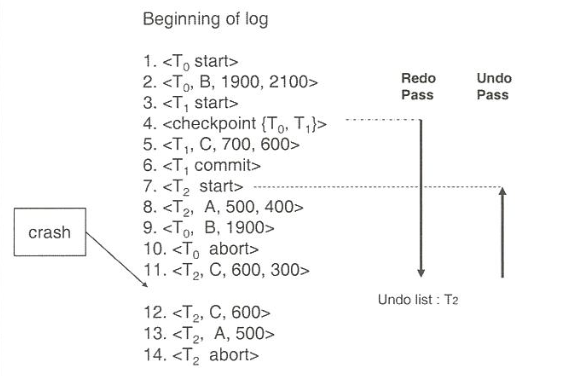 -> undo-list가 비워질 때까지 반복 (모든 미완료 트랜잭션의 <.Ti start> 로그를 찾을 때까지)
