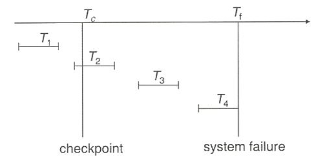 T1: 연산이 이미 디스크에 반영되어 있음 (검사점 연산으로 인해)