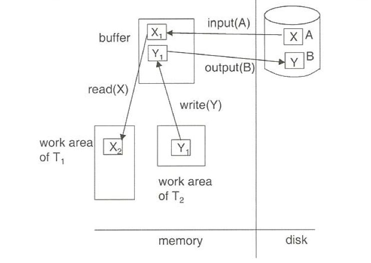 - 출력(B): 메모리의 버퍼 블록 B를 디스크로 전송하여 영구 저장 (필요 시 수행)