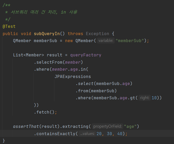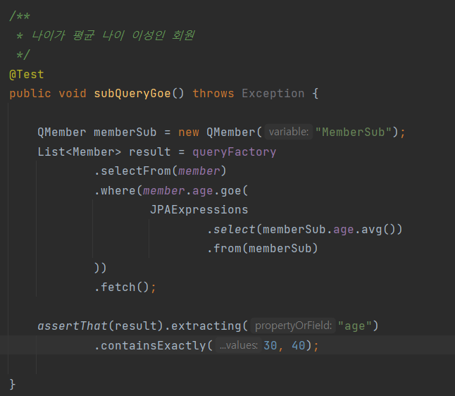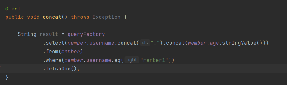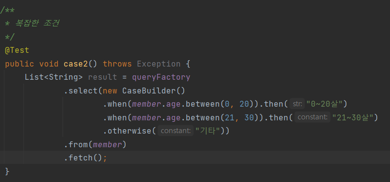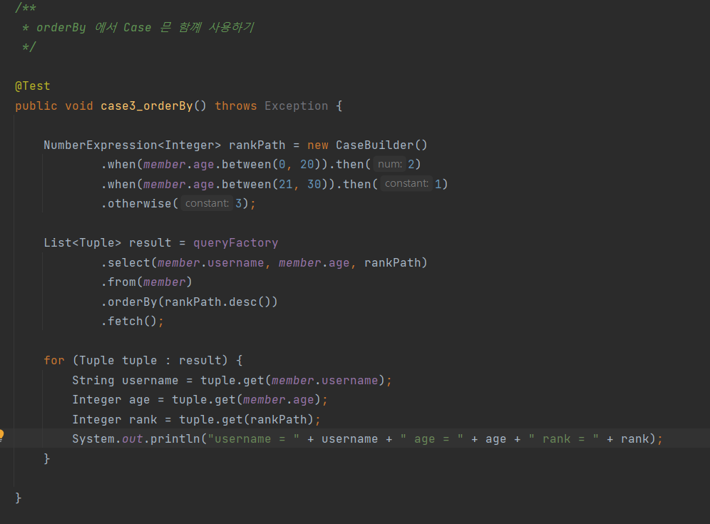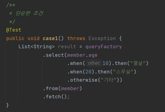 member.age.stringValue()부분이 중요한데, 문자가 아닌 다른 타입들은stringValue()로 문자로 변환할 수 있다. 이 방법은 ENUM을 처리할 때도 자주 사용한다.